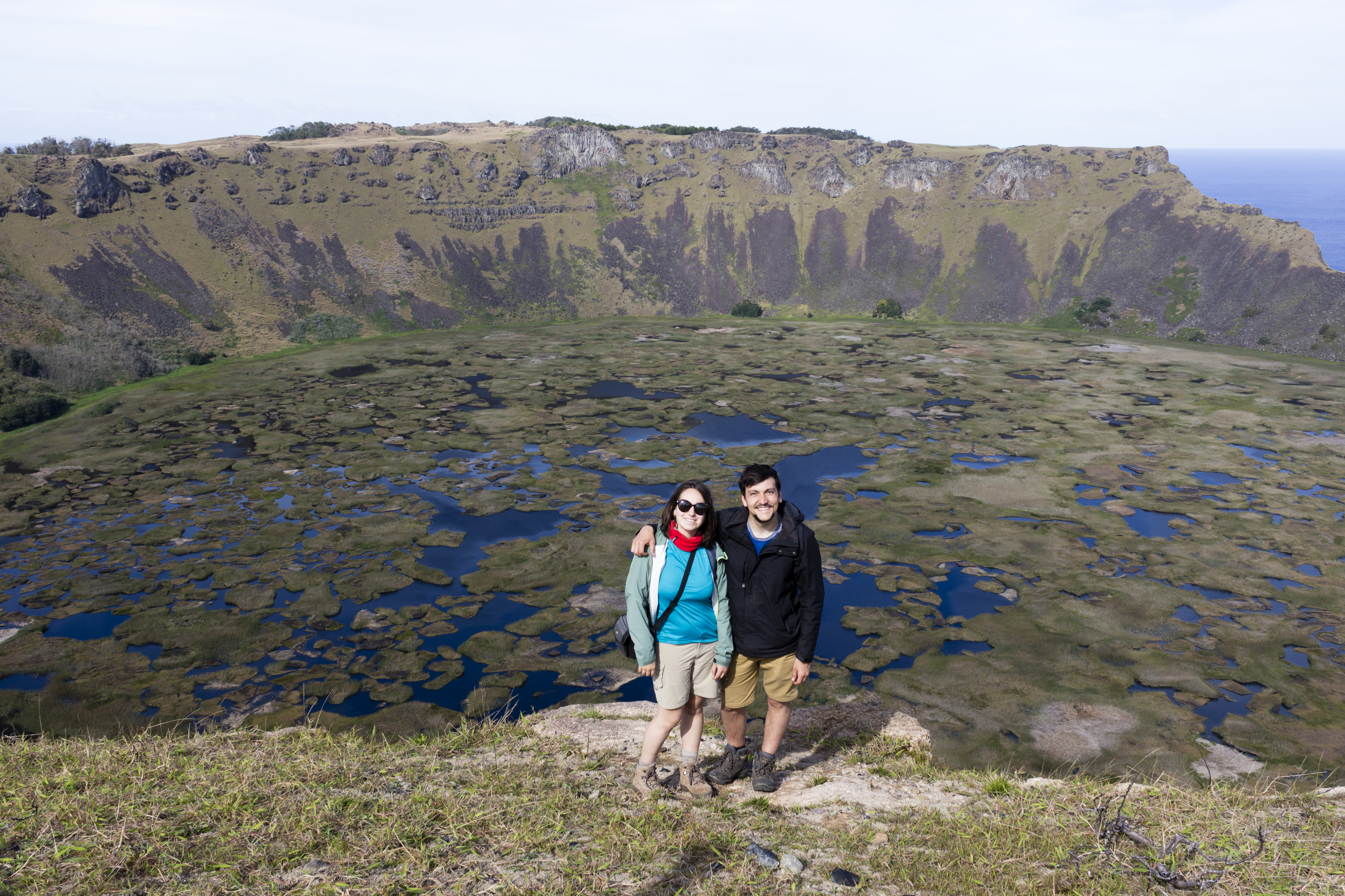 Si miramos hacia el sur desde Hanga Roa observaremos una gran colina justo detrás del aeropuerto de la isla. Este monte es el volcán Rano Kau y es otra de las visitas obligadas de Rapa Nui. Tras una ascensión un tanto durilla a pie (nosotros por eso la hicimos en quad) llegamos al borde del cráter. Allí, podrás maravillarte con la laguna interior del cráter, y si miras hacia atrás, podrás ver los límites netos de la isla y su característica forma triangular. El cráter de este volcán ha conseguido aislar muchas especies nativas de la influencia de los diferentes colonizadores, siendo hoy el último lugar de Isla de Pascua donde podemos encontrar auténtica flora nativa. Mientras continúas bordeando el volcán, podrás llegar a hasta la aldea ceremonial de Orongo, un ejemplo magnífico de la arquitectura Rapa Nui. Toda una pequeña ciudad resiste todavía en pie entre el cráter del volcán y un acantilado vertical que acaba en el Océano Pacífico.