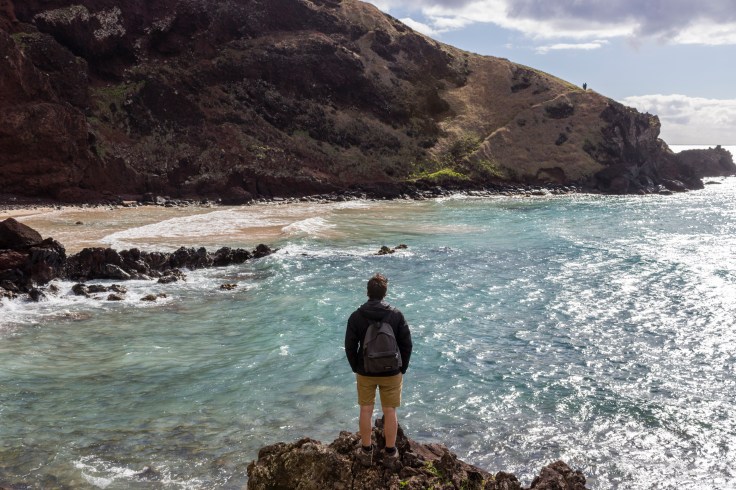 Más al norte, tras una caminata por una costa salpicada de rocas negras volcánicas que contrastan con el celeste del agua, encontramos Ana Kanenga (o Cueva de Los dos Ojos). La entrada se encuentra un poco retirada del camino principal, pero es fácil de encontrar. Deberás meterte por un angosto hoyo en el suelo e irte deslizando con cuidado de no darte un golpe en la cabeza hasta que la cueva se ensancha terminando en dos oquedades (ventanas) que regalan unas vistas muy particulares. Nosotros en este punto tuvimos que volver para ver el atardecer, pero más al norte se ubica el Ahu Te Peu, que es un yacimiento arqueológico de primer nivel que cuenta con múltiples manavai (o casas con forma elíptica) que fueron habitadas por los antiguos Rapa Nui.