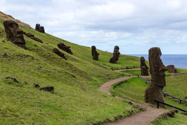 Finalmente, divisarás a la izquierda la cantera de Rano Raraku, un imponente volcán con múltiples moáis en sus laderas. La visita de este lugar es increíble y permite apreciar la complejidad que implica esculpir directamente de la roca madre cada moai. De hecho, podrás observar algunos moáis de hasta 15 metros que todavía están sin extraer de la montaña. Es una sensación indescriptible ir caminando entre cientos de moáis vigilantes mientras imaginas cómo narices fueron capaces de transportar semejantes monolitos hasta la costa.