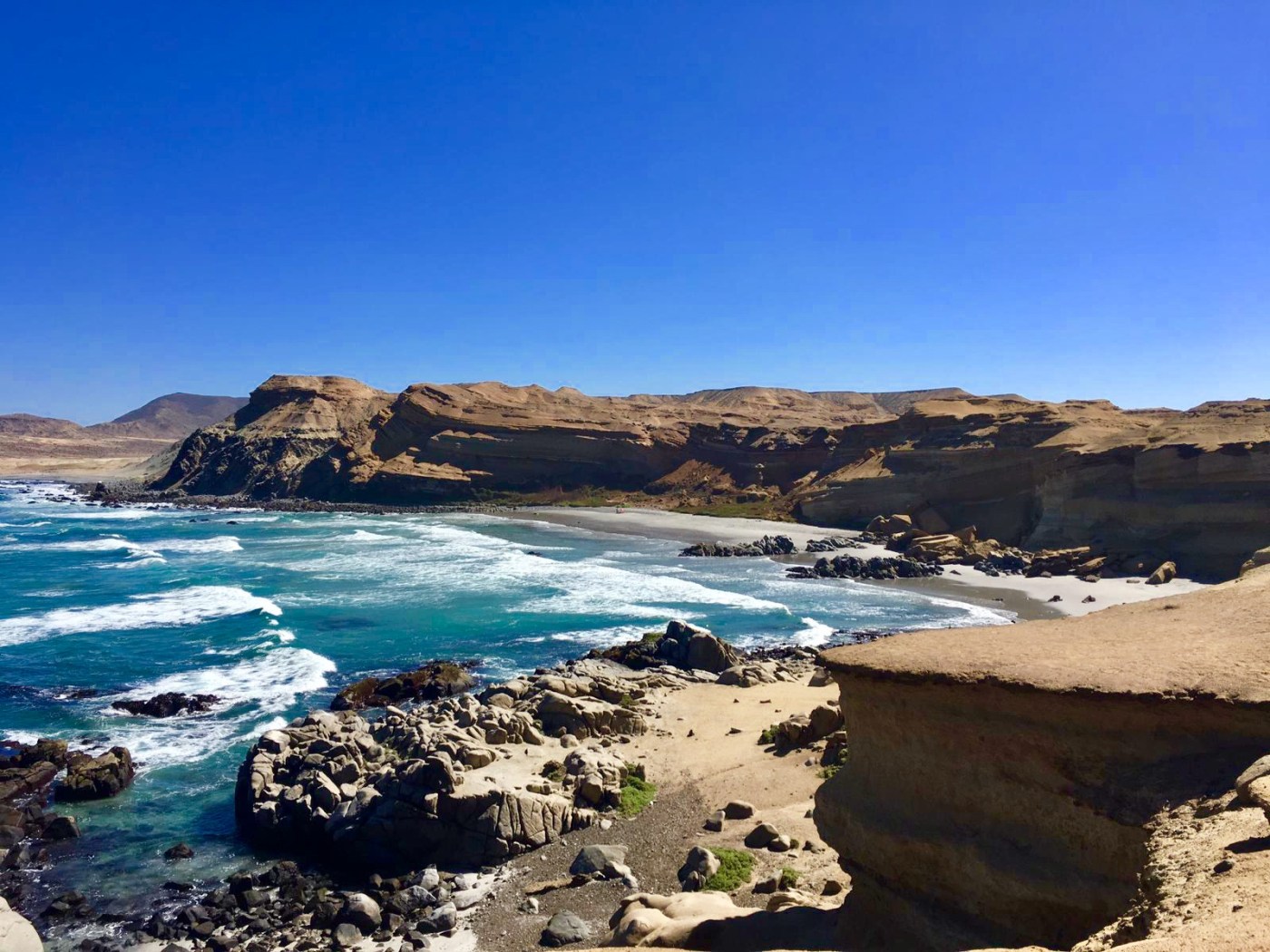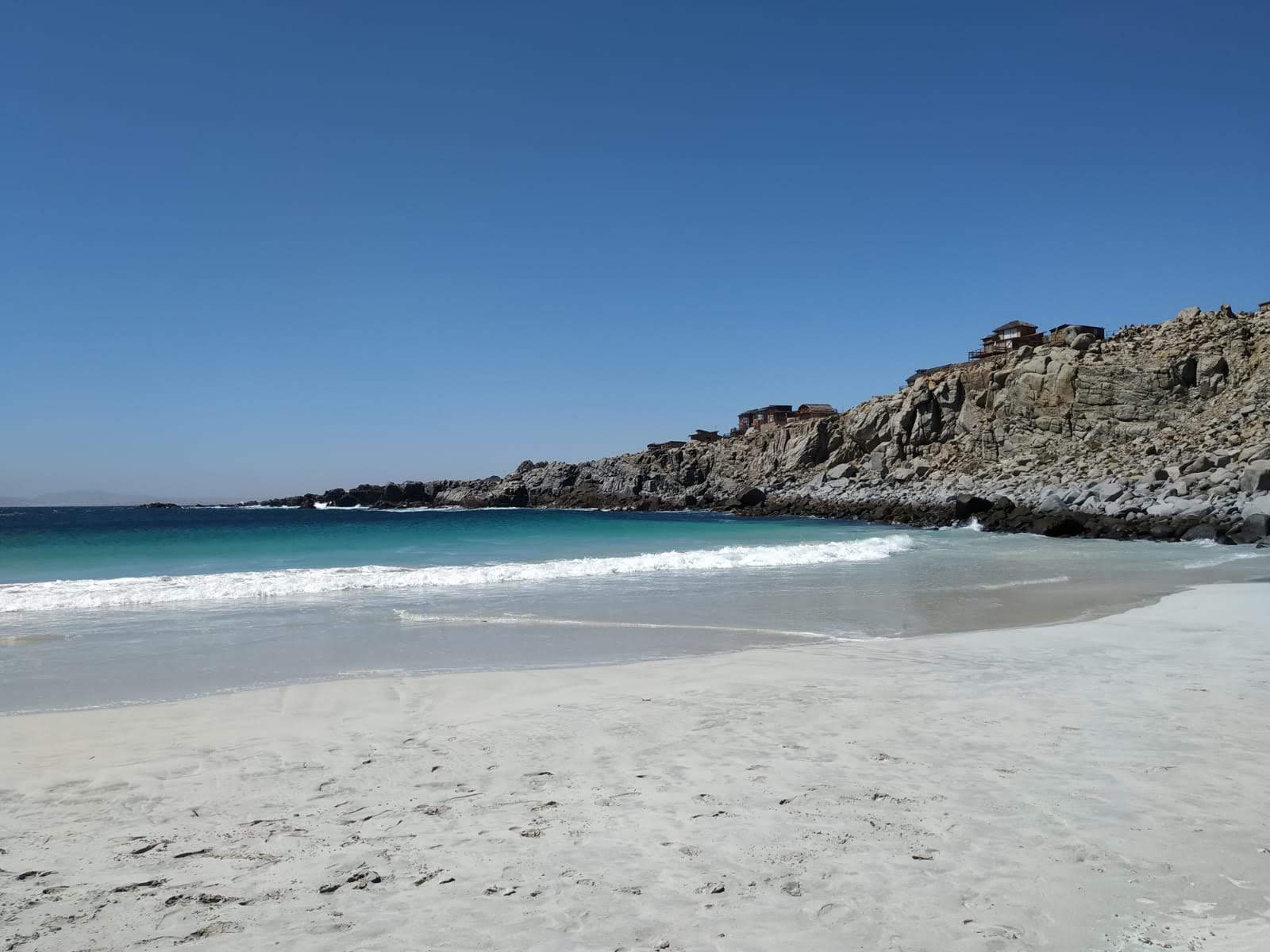 -Bahía Inglesa. El pueblo en sí es muy pequeño y está bien para pasear por la costa. Lo mejor es el azul claro del agua sobre la fina arena blanca y el contraste con las rocas negras de la bahía.